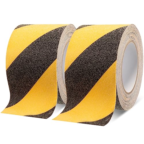 Pangda Abrasive Anti Slip Tape Self Adhesive Grip Tape Caution Warning Outdoor Stair Treads Traction Anti Slip Safety Grit for Stairs Ramps Skateboards Floor Deck, Yellow Black (2 Rolls, 4 In x 30 ft)