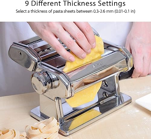 Pasta Machine, ISILER 9 Adjustable Thickness Settings Pasta Maker, 150 Roller Noodles Maker with Aluminum Alloy Rollers and Cutter for Pasta, Spaghetti, Fettuccini, Lasagna