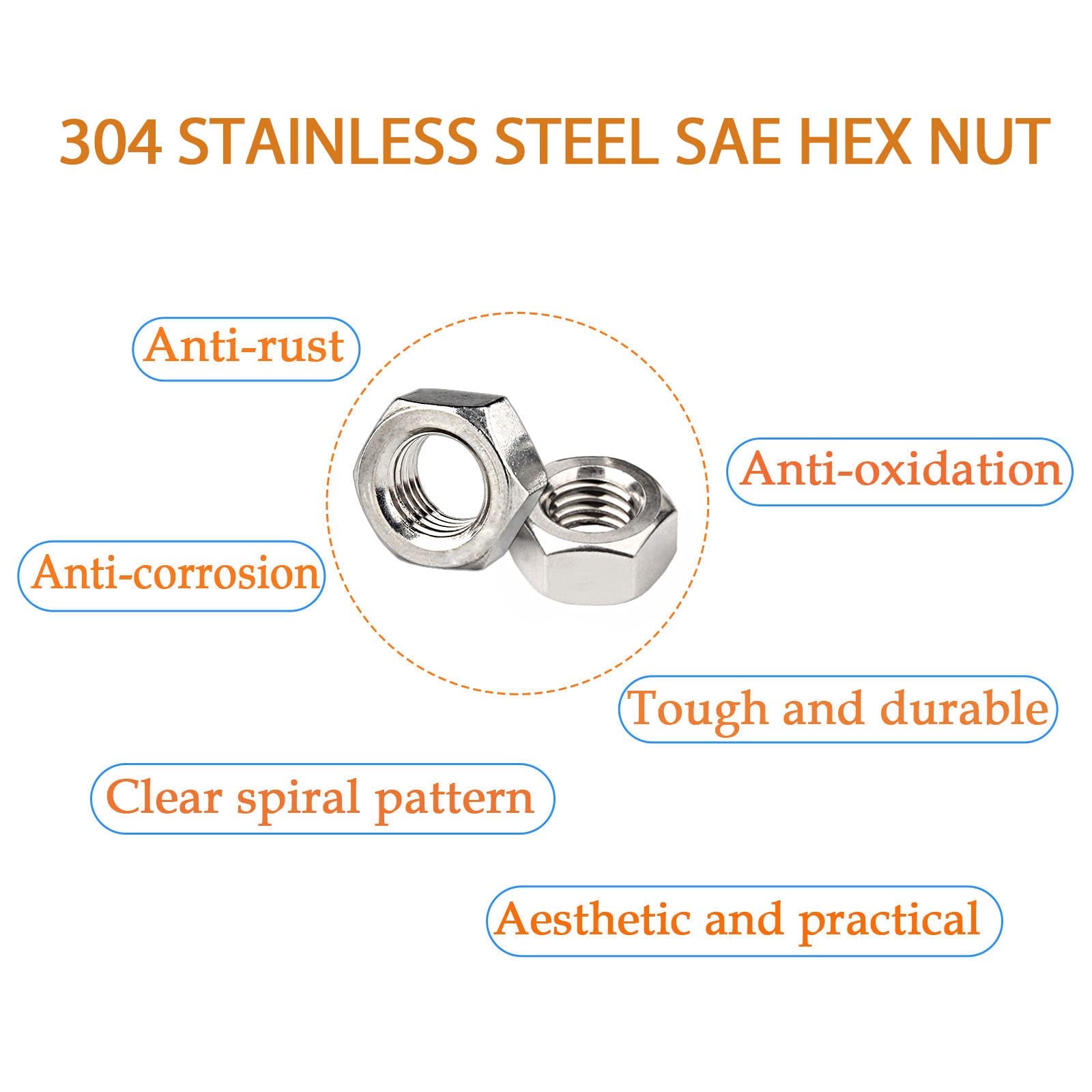 • 【High Quality】:Sae Hex nut hardware kit made of high quality 304 stainless steel,which features is strength strong,weak magnetic offers good corrosion resistance in bad environment like high temperature,superior rust-proof,prevent the bolt from being exposed and falling off,providing better firmness.