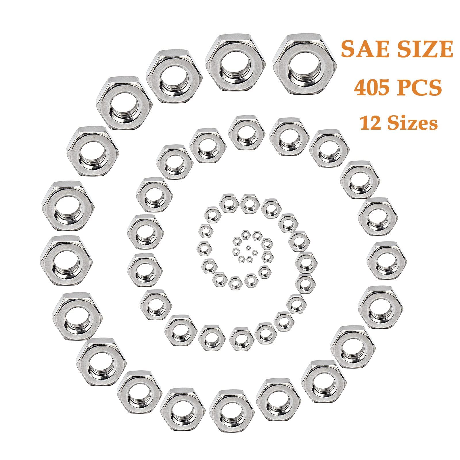 • 【Package】:A box of 405 pieces in total,all of sae hex nuts hardware set are packed in clear storage boxes with size labels of the whole package.in order to avoid the nuts being scattered or lost during and mixing.